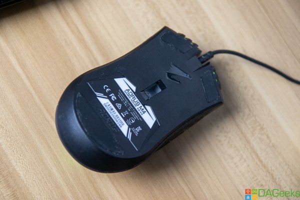 Let’s start with the shape. The Aorus M4 feels great if you’re a palm grip kind of guy. It fits my medium-sized hands pretty well and the hump in the back gives you a great sense of control. The scroll wheel is responsive and the side buttons are placed adequately near the thumbs and are not hard to press. There’s a slight issue here if you use a claw grip. I find that even though the left and right switches are unibody if you press somewhere in the middle, the click won’t register. It’s a hit and miss really.