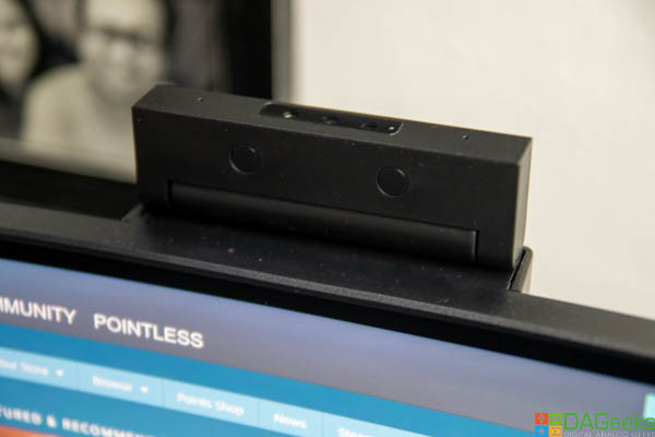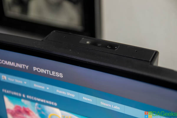 The ergonomic base lets you tilt, swivel and adjust the height of the screen. It has enough flexibility for a comfortable line of sight with your direct and peripheral vision for optimum comfort. There’s also a nifty hidden webcam at the top that pops up when you press on it.