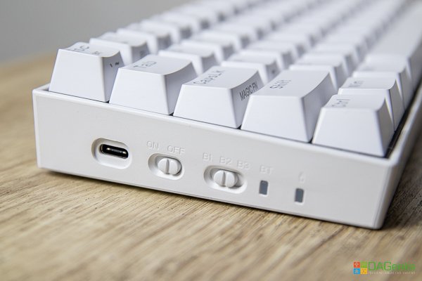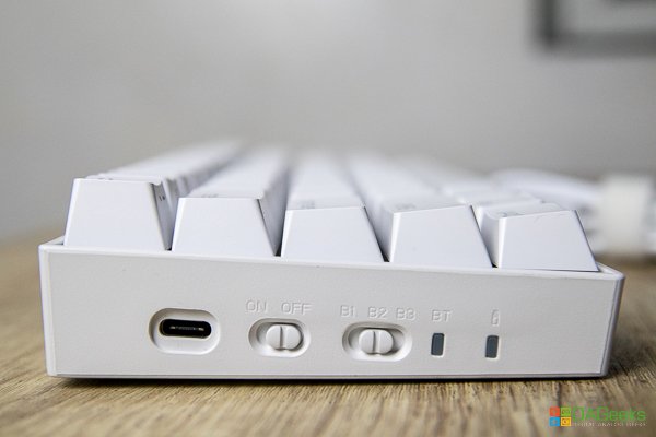 On the left-hand side, you have your USB-C port, an ON/OFF toggle button, which also toggles between wired/wireless mode; another toggle for which device you want the keyboard to connect, which is more convenient as you can easily see which device the keyboard is connected to; and 2 LED lights, one is for Bluetooth status and the other is for battery status. As for its juice, it’s powered by a 3,000mAh battery, ensuring you have plenty of power when using this in wireless mode even when the RGB lights are on.